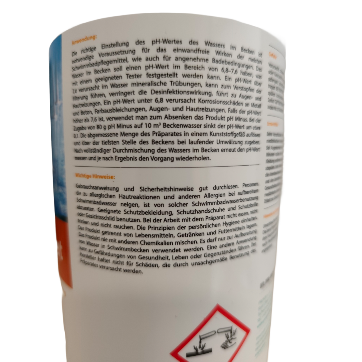 Ако pH стойността е над 7,6, се използва pH Minus 1,5 kg, за да се понижи целенасочено и по този начин водата за плуване да достигне оптимални стойности.