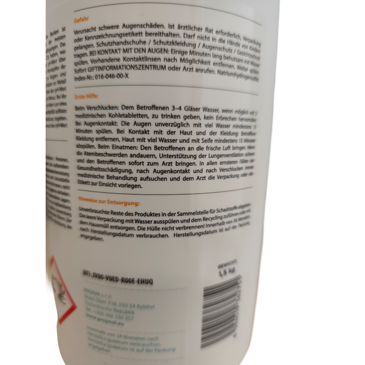 Бързото регулиране на pH и бързото разтваряне на pH Minus 1.5 kg са това, което го отличава, позволявайки ви бързо да постигнете желаното качество на водата. Благодарение на безопасното си приложение в сравнение с течните версии, продуктът минимизира потенциалните рискове и позволява безгрижно удоволствие от къпането само няколко часа след нанасяне.