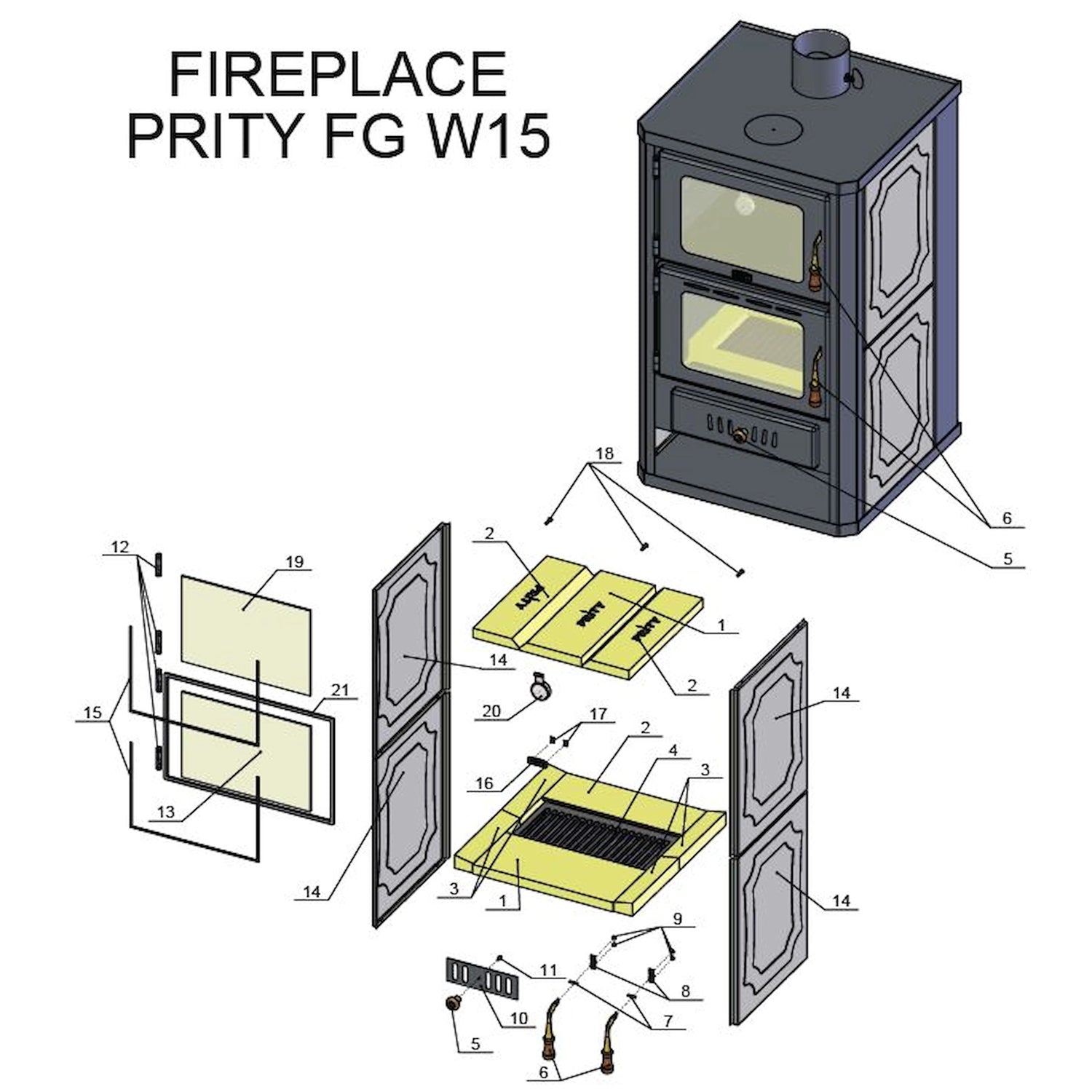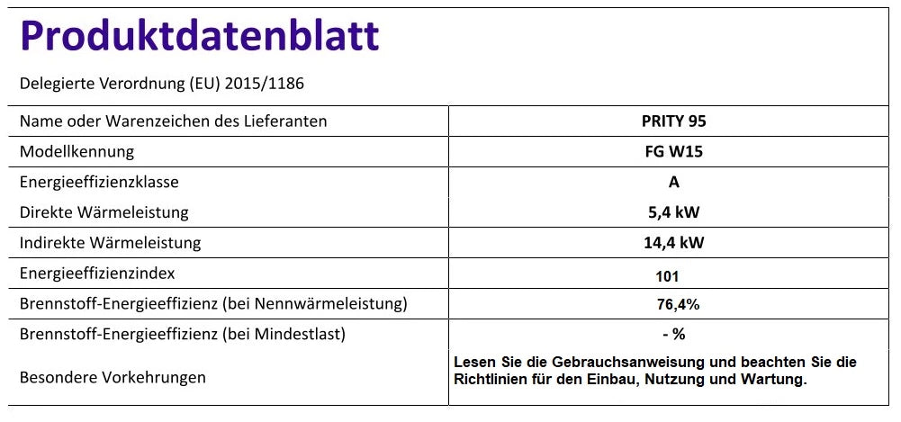 Прити ФГW15 Този модел отговаря на конструкция тип 2 и няма самозатваряща се врата; следователно, германското законодателство изисква отделен комин или, алтернативно, допълнително монтиране на пружина за врата. Вграден демпфер във връзката на димоотводната тръба позволява фина настройка на тягата.