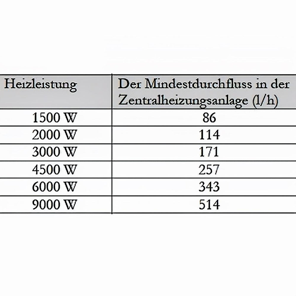 Minimální průtoky – 86 l/h pro 1,5 kW, 114 l/h pro 2,0 kW, 171 l/h pro 3,0 kW, 257 l/h při 4,5 kW, 343 l/h při 6,0 kW a 514 l/h při 9,0 kW – zaručují efektivní přenos tepla a plynulý provoz i při proměnlivých požadavcích na teplo.