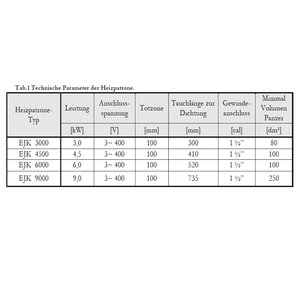 Topná patrona kompletního balíčku je k dispozici v různých výkonových třídách, speciálně navržených pro 1,5 kW, 2,0 kW, 3,0 kW při 230 V a 4,5 kW, 6,0 kW a 9,0 kW při 400 V. Tyto varianty umožňují optimální přizpůsobení individuálním energetickým požadavkům topného systému.