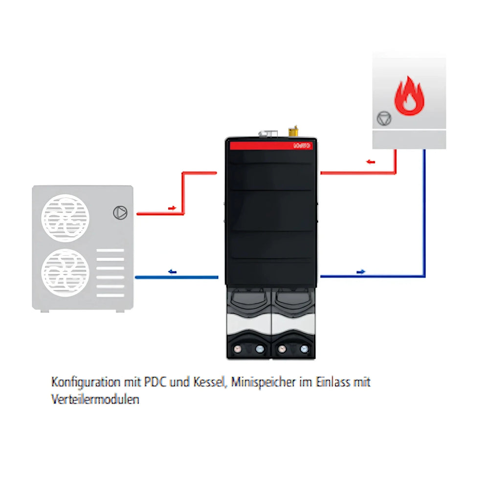 Buffertanken muliggør tilslutning af op til to energikilder, såsom en varmepumpe og en konventionel kedel. Kredsløbet dedikeret til varmepumpen, med en flowhastighed på op til 4,5 m³/t, sikrer optimal udnyttelse af lagringsvolumen og øger driftstiderne og energieffektiviteten i dit system.