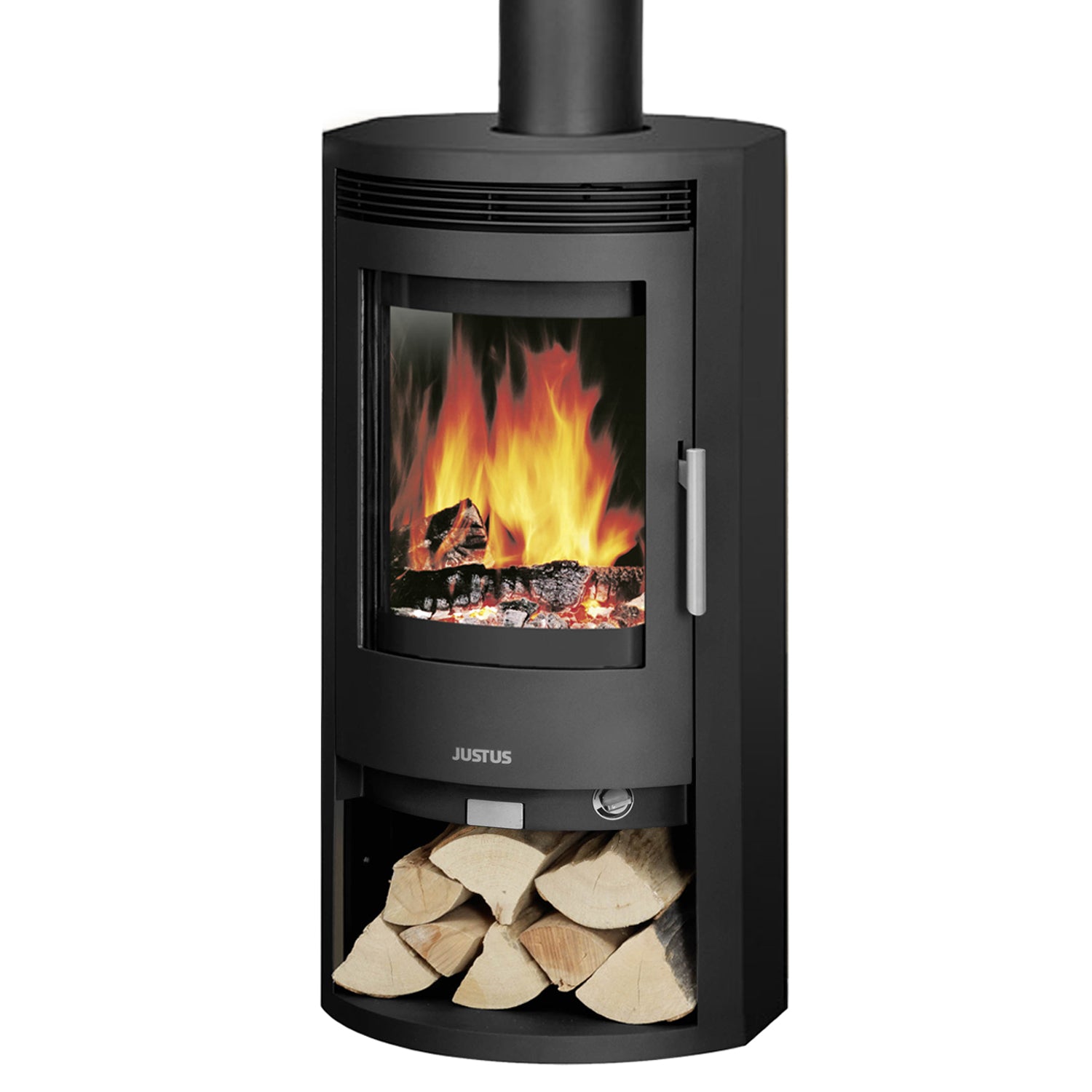 Beneath a sturdy cast iron grate is an ash box, and below that a spacious compartment offers room for storing firewood – practically and space-savingly integrated.