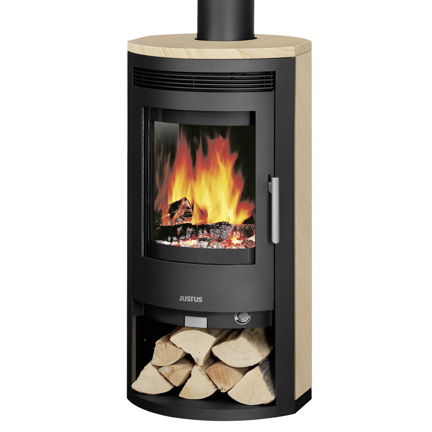 The stove can burn both wood and lignite briquettes. With lignite briquettes, a glowing ember bed can be maintained for up to 12 hours, thus requiring less frequent refueling.