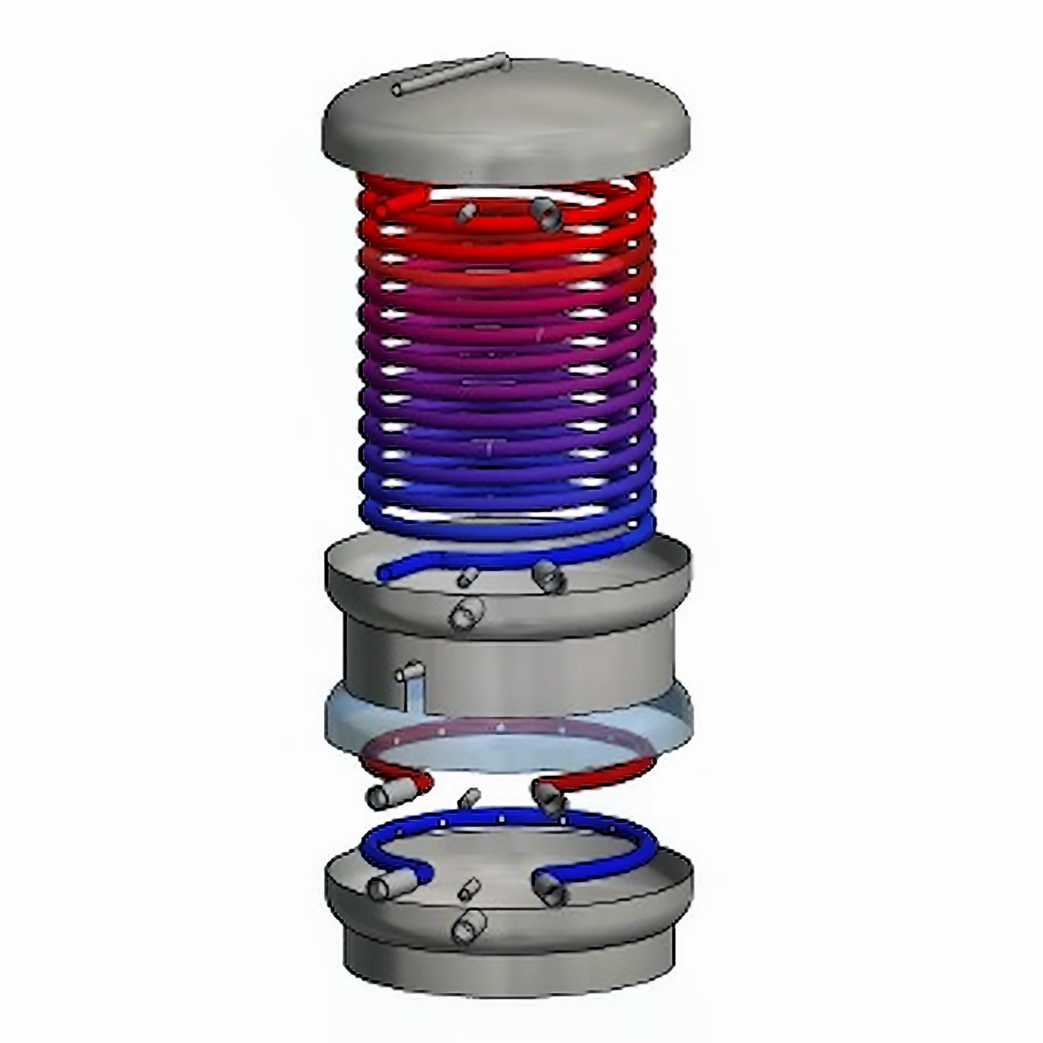 Sa chuid uachtarach, téann an píopa rocach cruach dhosmálta uisce óil ag baint úsáide as prionsabal an tsreafa tríd, rud a chiallaíonn nach stóráiltear ach méideanna beaga uisce agus go laghdaítear an riosca Legionella go suntasach. Stórálann an maolán ar leith sa chuid íochtarach fuinneamh teasa le haghaidh oibriú an chaidéil teasa agus ag an am céanna ligeann sé do dhifríochtaí móra teochta idir na codanna.
