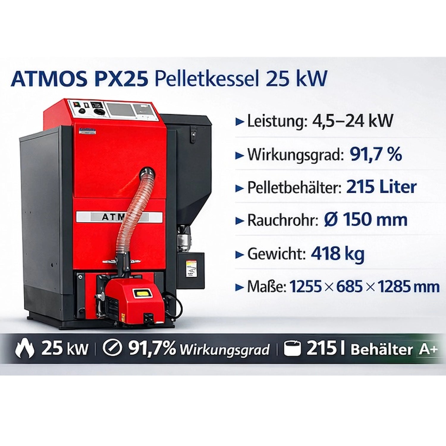 Iz integriranog silosa, unutarnji pužni transporter transportira i dozira pelete do jedinice postavljene na donjoj prednjoj strani. ATMOS A25PX plamenik na peleteOvaj model se u nekoliko detalja razlikuje od peletnih plamenika A25 koje Atmos inače koristi i proizvodi od 2010. godine. Na primjer, cijev za punjenje je ravna, a ne pod kutom kao obično, a softver se također razlikuje od standardne verzije u nekoliko osnovnih parametara. Inače, međutim, peletni plamenik je konfiguriran identično kao i ostali plamenici A25, A25GSP, A45 i A85. To je velika prednost koju nudi Atmos, jer je instalater odmah upoznat sa bilo kojim od naših plamenika nakon što je radio samo s jednim. Od ožujka dostupni su i novi ATMOS PX10 i ATMOS PX25. Manji PX10 ima maksimalnu snagu od 10 kW, a PX25 ima 24 kW. Oba ova kotla na pelete također ispunjavaju uvjete za financiranje BAFA-e (Savezni ured za ekonomske poslove i kontrolu izvoza). Financiranje je dostupno ako se istovremeno ugradi međuspremnik s minimalnim kapacitetom od 30 litara po kW snage kotla. Novi program financiranja BAFA-e za 2020. subvencionira ugradnju novih sustava grijanja na pelete do 45%.