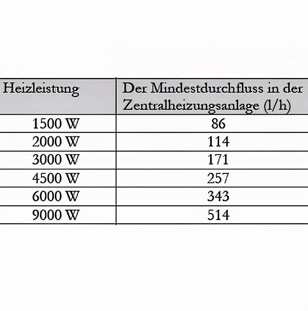 Minimalni protoci – 86 l/h za 1,5 kW, 114 l/h za 2,0 kW, 171 l/h za 3,0 kW, 257 l/h pri 4,5 kW, 343 l/h pri 6,0 kW i 514 l/h pri 9,0 kW – jamče učinkovit prijenos topline i nesmetan rad čak i uz različite potrebe za toplinom.