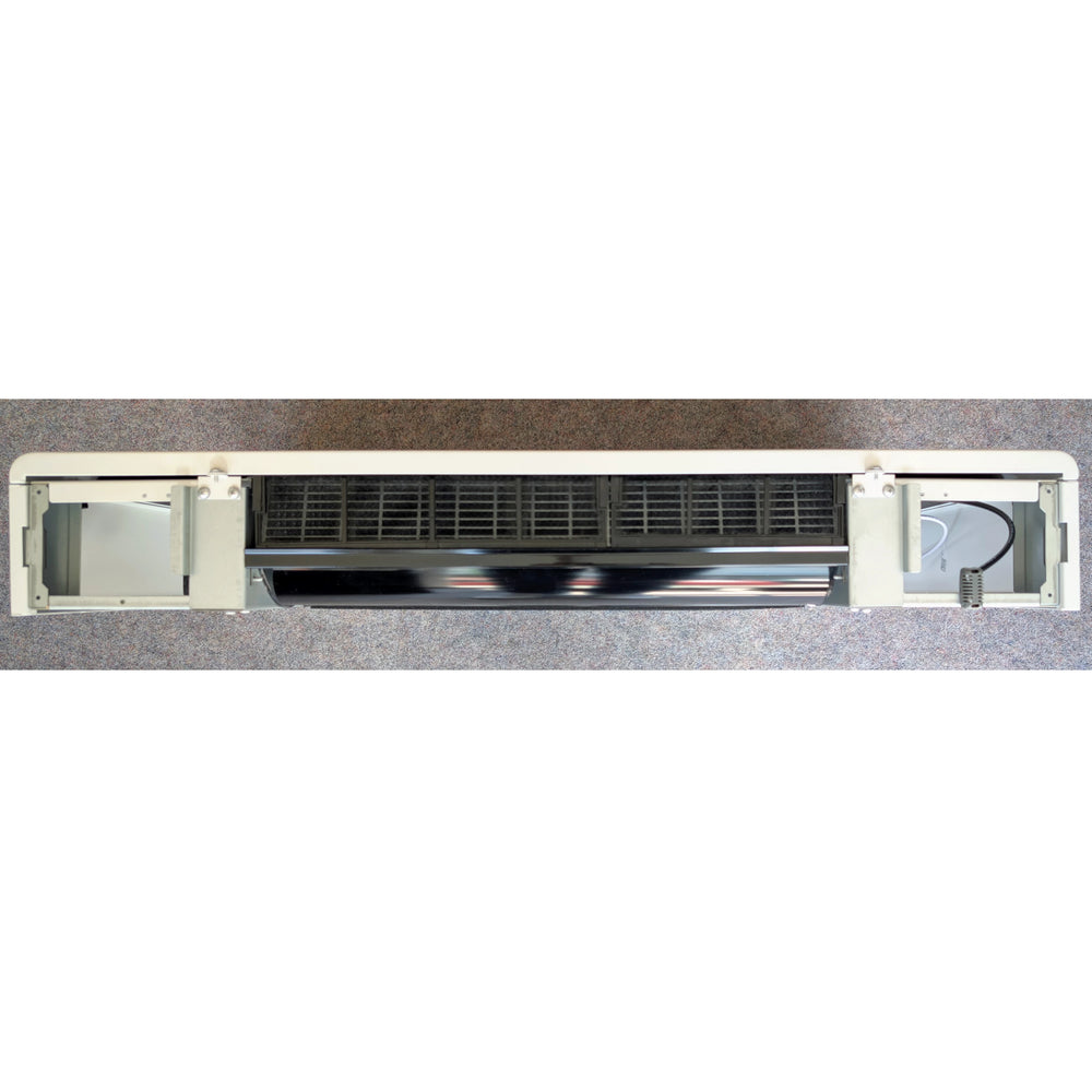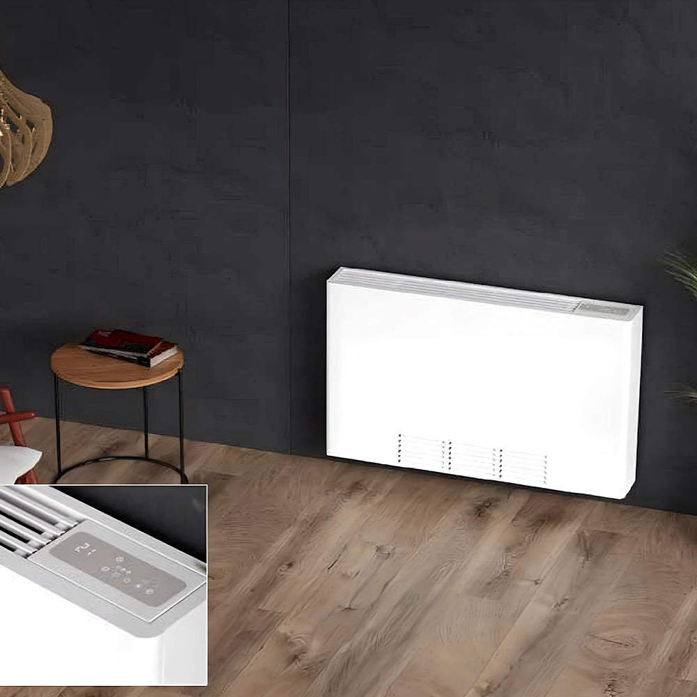 Il termoconvettore VNT WI-FI è un ventilconvettore a parete per riscaldamento e raffrescamento, dotato di tecnologia DC Inverter e controllo Wi-Fi. Combina un design compatto, alette in alluminio e una struttura in metallo verniciato con un controllo moderno tramite il pannello di controllo integrato o l'app Smart Life.