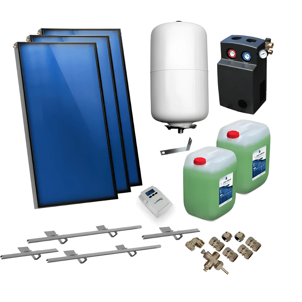 Il pacchetto solare viene fornito come set completo. Oltre ai tre collettori piani AMX 2.38, la fornitura comprende tutti i componenti essenziali, come il kit di collegamento, il kit di montaggio, il vaso di espansione solare, nonché la moderna stazione solare e il sistema di controllo solare. Istruzioni dettagliate aiutano gli installatori a eseguire un'installazione rapida e senza intoppi.