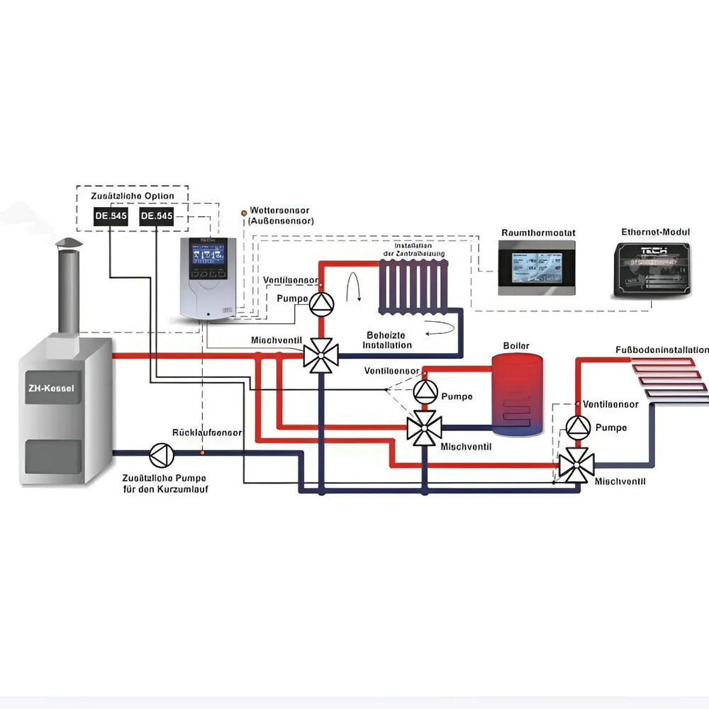 Laika apstākļu kompensēts apkures loka regulators TECH i-1 CWU (EU-i-1 karstā ūdens apgādes iekārta) Tas kontrolē 3/4 ceļu jaucējvārstu, tostarp vārsta sūkni un papildu karstā ūdens sūkni. Izmantojot āra sensoru (laika apstākļu kompensācija), nedēļas programmu un telpas termostata savienojumu, tas uztur stabilu turpgaitas temperatūru un nodrošina... Atpakaļplūsmas aizsardzība Uz katla. Ideāli piemērots modernizācijai un jaunbūvēm – gan privātmāju īpašniekiem, gan uzstādītājiem.