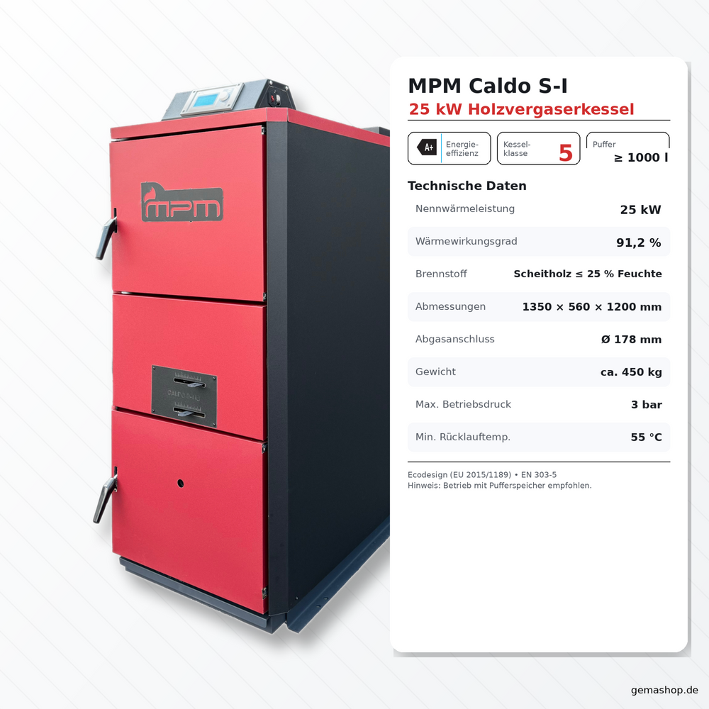 Kocioł zgazowujący drewno MPM Caldo S-I 25 kW A+ (Ekoprojekt, klasa 5)