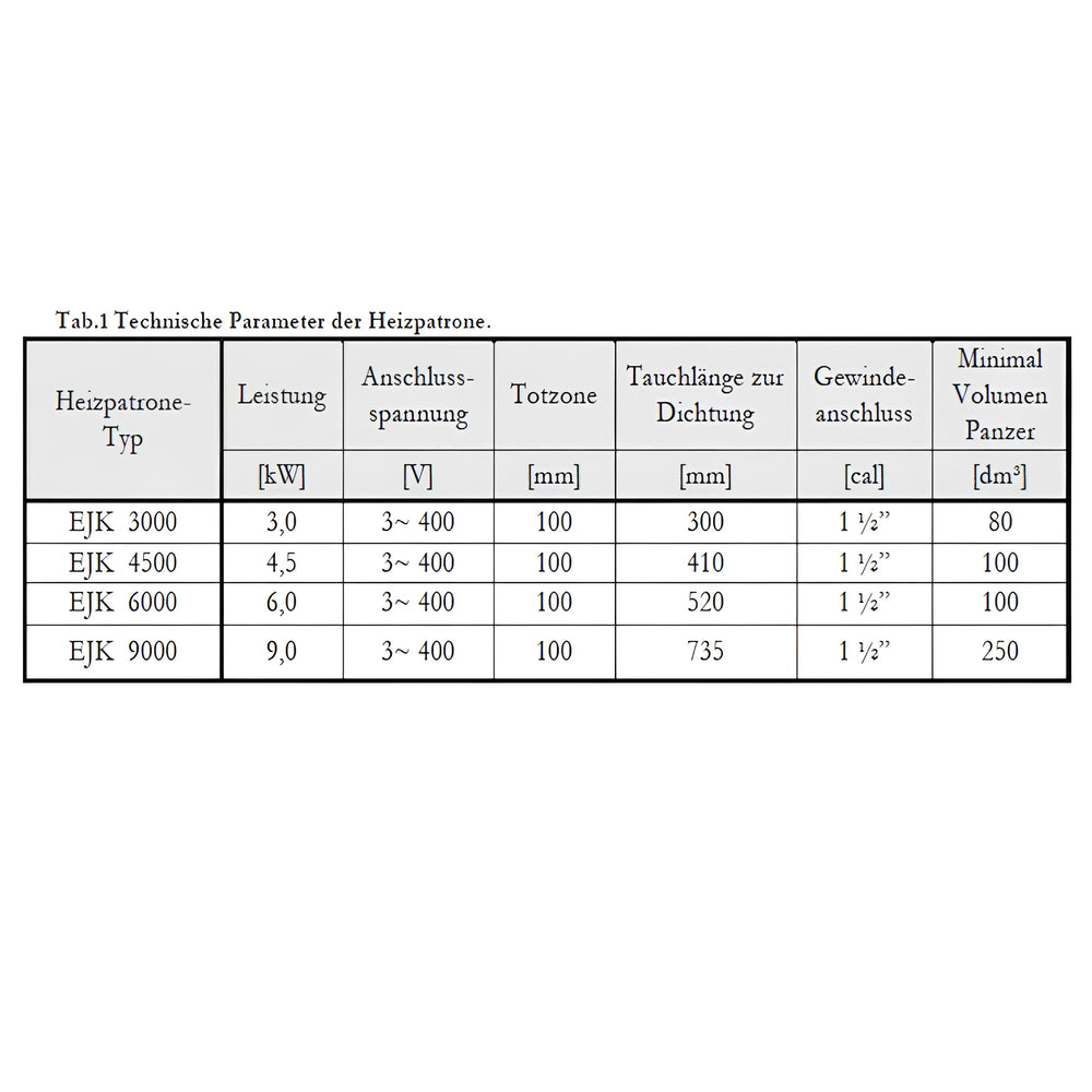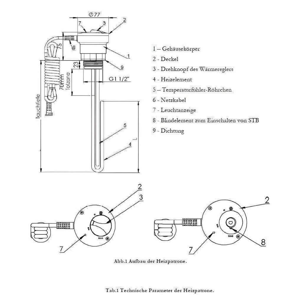 Elektrický vykurovací článok sa inštaluje pomocou závitu 1 1/2" a má inštalačnú dĺžku 400 mm a nevykurovanú dĺžku 70 mm. 1,5 m dlhý pripojovací kábel so zástrčkou Schuko umožňuje jednoduché uvedenie do prevádzky.