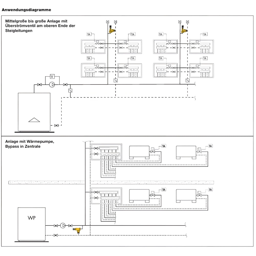Vhodné pre vykurovacie, chladiace a tepelné čerpadlá s premenlivým prietokom. Obzvlášť užitočné v systémoch s viacerými spotrebičmi, pohonmi alebo čerpadlami s reguláciou otáčok na zabezpečenie minimálneho prietoku a obmedzenia tlaku.
