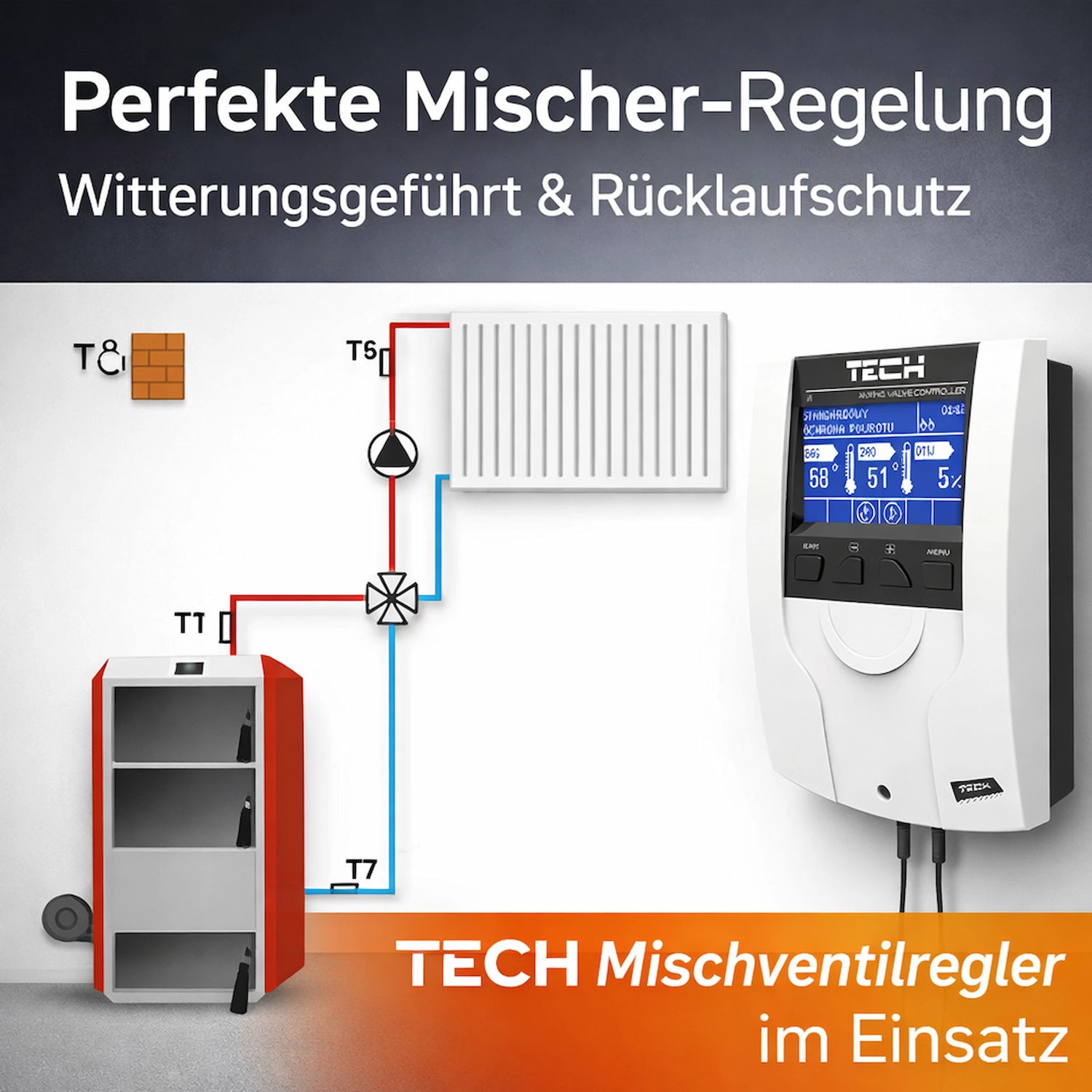 De TECH EU-i-1 blandningsventilstyrenhet kontrollerar en 3- eller 4-vägs blandningsventil inklusive Ventilpump och upprätthåller tillförlitligt önskad framledningstemperatur vid ventilens utlopp. Det stöder effektiv systemdrift. Väderkompenserad styrning (värmekurva), Veckoprogram såväl som samarbetet med Rumstermostater (RS-kommunikation eller tvåpunktskommunikation). Dessutom skyddar styrsystemet värmegeneratorn genom att Återflödesskydd (mot alltför låga returtemperaturer) och valfritt pannskydd (Överhettningsskydd).