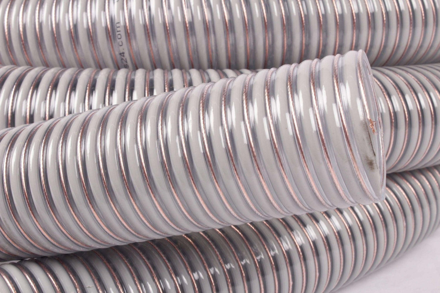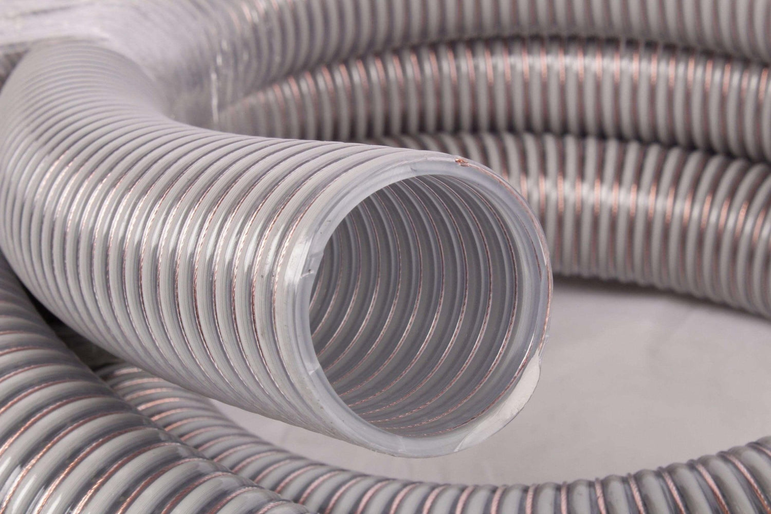 Slangen är antistatisk och tillverkad av PVC med en inbäddad styv PVC-spiral och integrerade koppartrådar. Var särskilt noga med jordning på båda sidor.